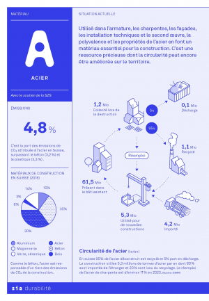 Avec ces fiches, l’objectif est de fournir aux professionnel·les ainsi qu’aux maîtrises d’ouvrages des informations simples et claires au sujet de divers matériaux et d’autres thèmes liés à la durabilité dans la construction. Grâce à des infographies, des chiffres et des liens utiles, les fiches donnent un aperçu rapide des éléments clés liés à un matériau ou un sujet.
